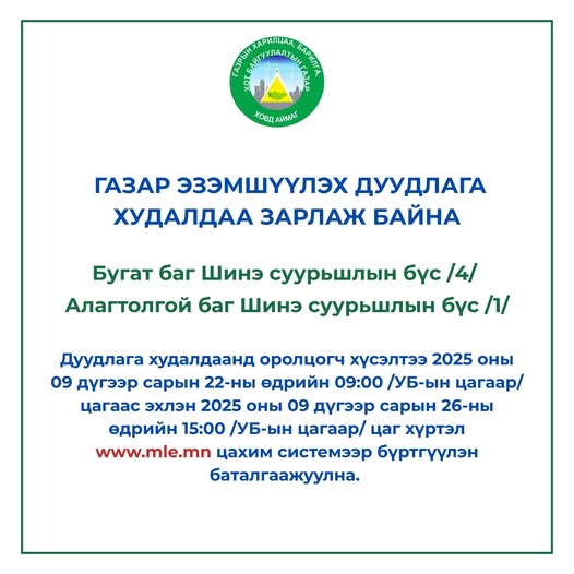 ГАЗАР ЭЗЭМШҮҮЛЭХ ДУУДЛАГА ХУДАЛДАА ЗАРЛАЖ БАЙНА