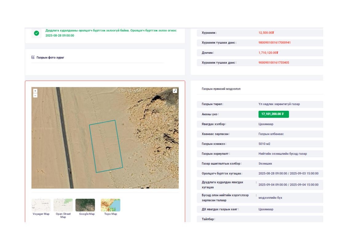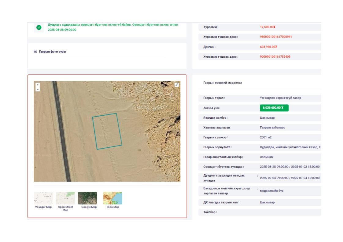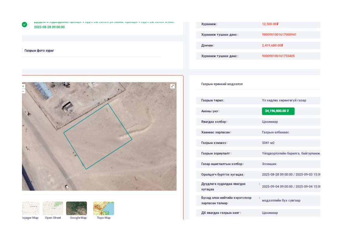 Газар эзэмшүүлэх, ашиглуулах эрхийн цахим дуудлага худалдааг 2025 оны 09 дүгээр сарын 4-ний өдөр зохион байгуулахаар төлөвлөж байна. Та www.mle.mn сайт руу хандан Ховд аймгийн Жаргалант сумыг сонгож, төлөвлөгдөж байгаа дэлгэрэнгүй гэдэг хэсэг рүү орж бүртгэлээ хийлгэх боломжтой.