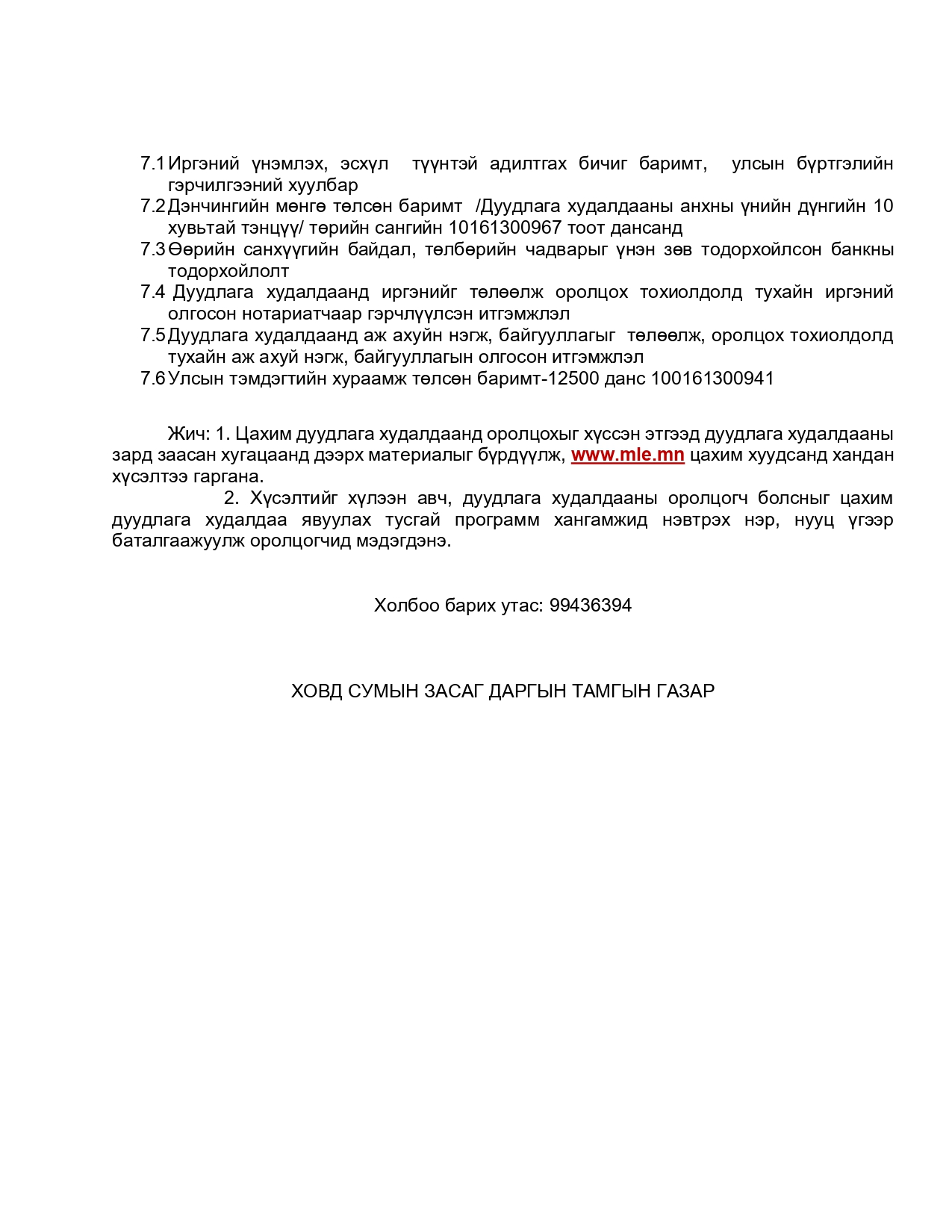 Холбоо барих утас: 99436394