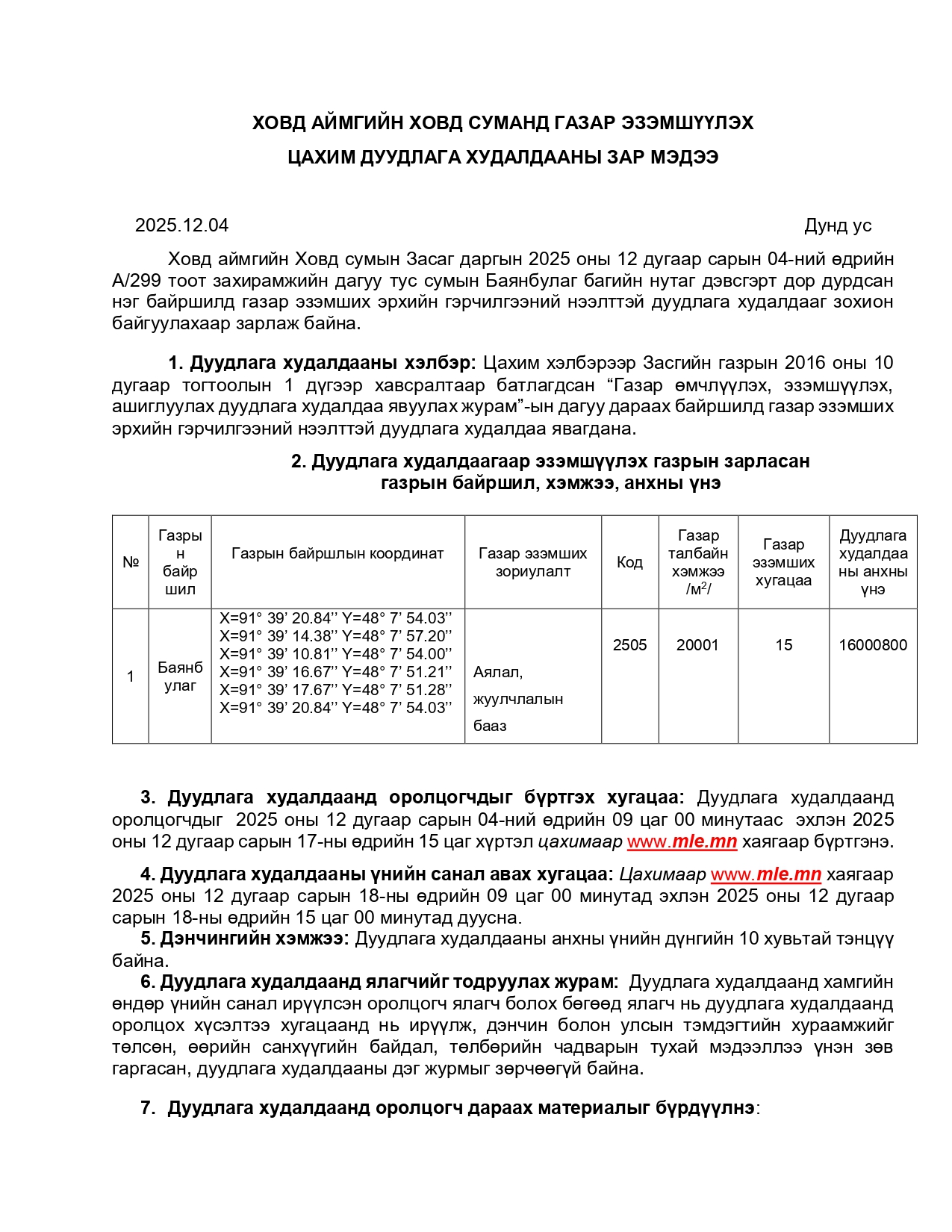 Дуудлага худалдаанд оролцогчдыг бүртгэх хугацаа: Дуудлага худалдаанд оролцогчдыг 2025 оны 12 дугаар сарын 04-ний өдрийн 09 цаг 00 минутаас эхлэн 2025 оны 12 дугаар сарын 17-ны өдрийн 15 цаг хүртэл цахимаар www.mle.mn хаягаар бүртгэнэ.